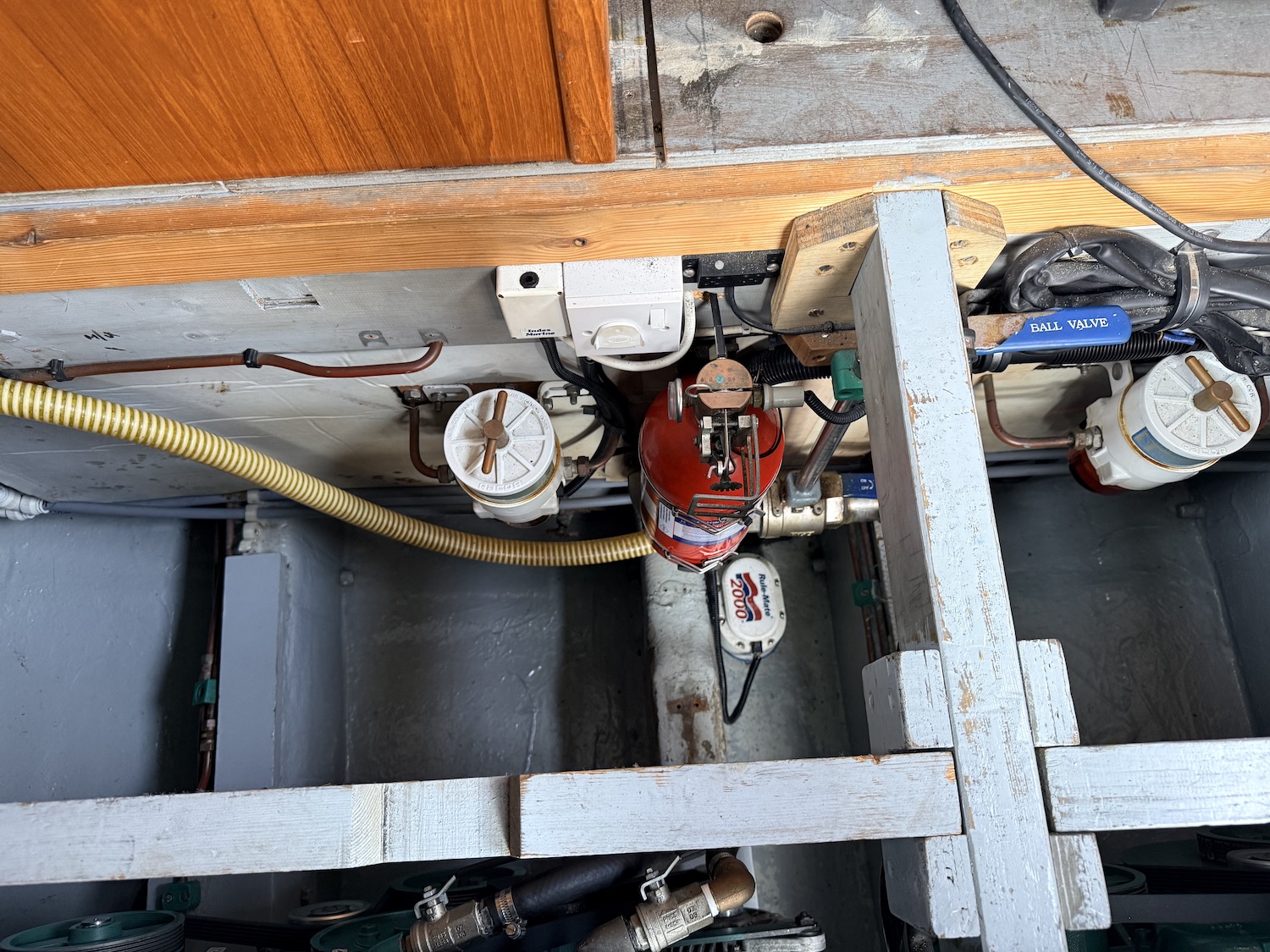 - Seafire automatic fire extinguisher in engine compartment with remote at helm