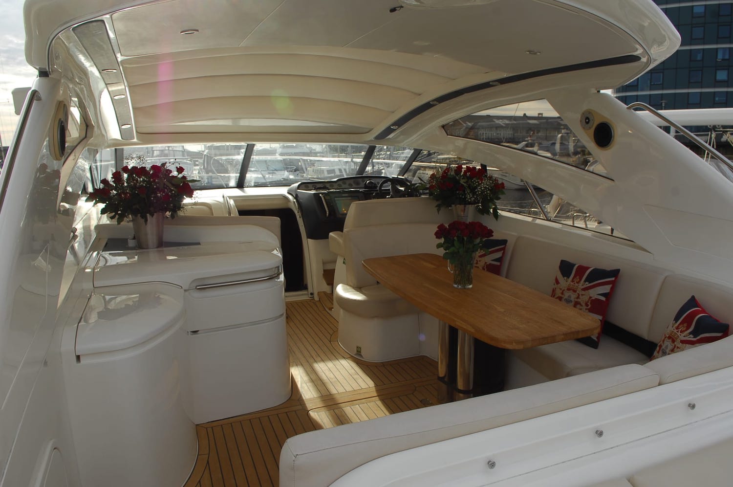 The Princess V48 is all about outdoor living.  The spacious cockpit offers generous seating, a large sunpad and a fully equipped wet bar — the perfect setting for entertaining family and friends while enjoying the open air.  An electric hardtop transforms the space at the touch of a button, giving you sun or shade whenever you want it.