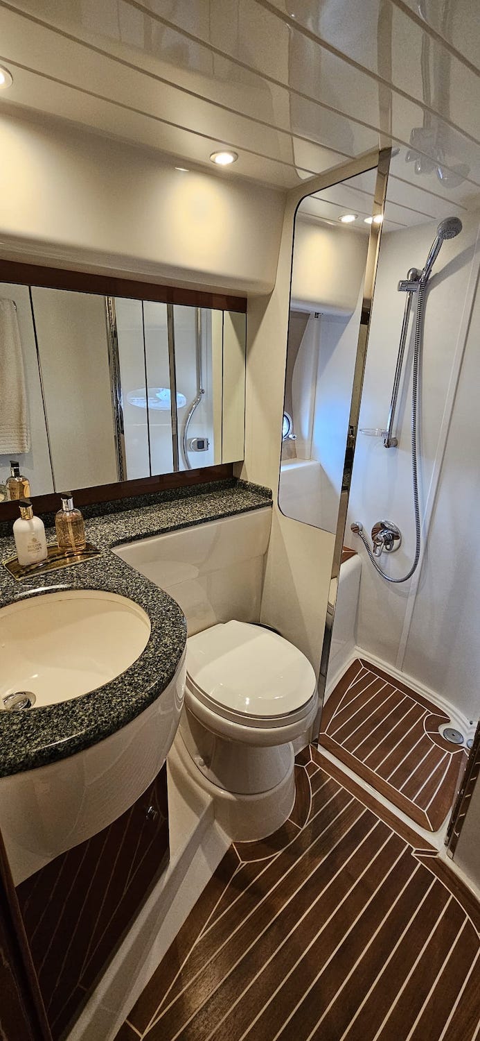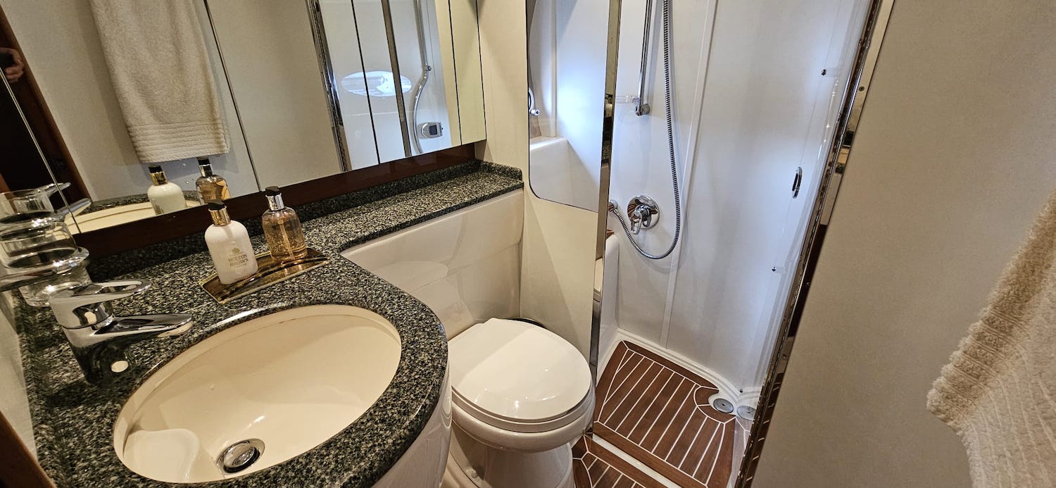 • En-suites in forward master and aft guest cabins with teak laid floors and granite style tops
